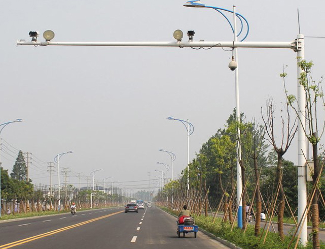 立桿要求攝像機(jī)離地面高度一般不低于5米,挑臂長度3~5米,立桿下端管徑應(yīng)在220 mm±10mm、上端管徑應(yīng)在120 mm±5mm,管壁厚度應(yīng)≥6mm,表面防腐、抗臺風(fēng)。立桿基礎(chǔ)深度不低于1.5米,基礎(chǔ)直徑大于1米,采用混凝土灌筑,以確保立桿的牢固度。